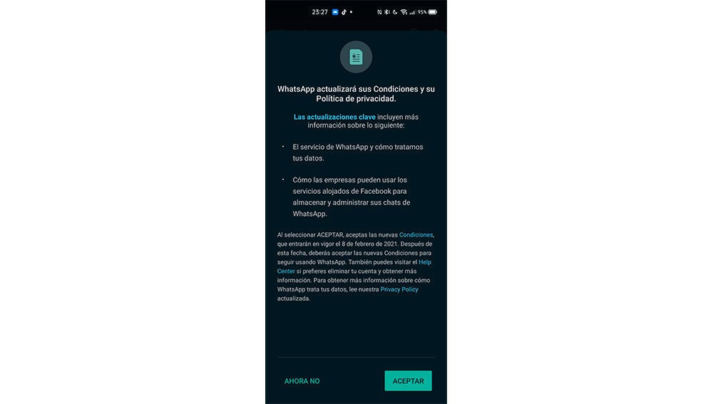 Y en caso de no ser aceptadas por los usuarios, el en la notificación que está rodando ya por todas las redes sociales, whatsapp hace un resumen de lo que contiene el documento original y de los.